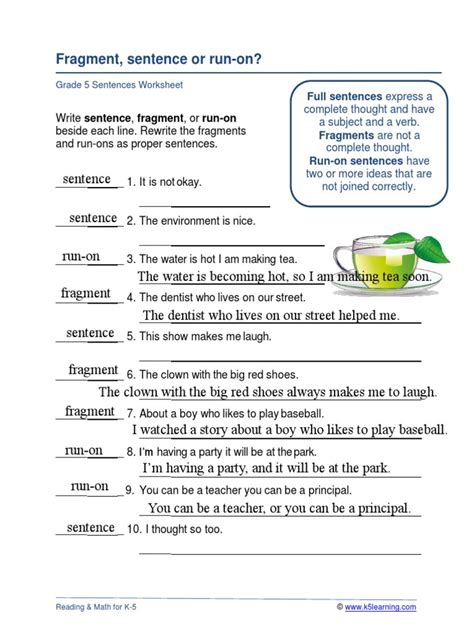Sentences worksheets: identifying fragments and run-ons. Fast and free shipping free returns cash on delivery available on eligible purchase.4 Types Of Sentences Worksheets Download Use & Care Manual Free.Fragments And Run On Sentences Worksheets Download Online Installation Instructions Manual Free.Building Great Sentences teaches you to write better sentences by luxuriating in the pleasures of language. Direction: Write a topic sentence for the group of sentences provided. In these worksheets, students identify sentence fragments and run-on sentences. The topic sentence tells the topic of the paragraph and the general idea regarding the topic that is going to be discussed. sentence 4. Add a subject or predicate to each fragment to make it a Fragments Run On Sentences - Displaying top 8 worksheets found for this concept. Complex sentences expand on that thought by adding on a dependent clause beginning with a conjunction. sentence 7. Paragraph Breakdown We focus on classifying the organization of the paragraphs. Download [120.97 KB] Fragments And Run-ons : This worksheet will cover run on sentences, comma splices and fragments. Convert simple sentences into compound/complex and vice versa. A sentence fragment is an incomplete sentence because it lacks a subject, lacks a verb, or is a dependent clause.